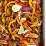 30 Minute Sheet Pan Chicken Fajitas are a quick and flavorful weeknight dinner made with tender chicken, colorful peppers, and bold Tex-Mex spices—all roasted together on one pan for easy cleanup. Serve with warm tortillas and your favorite toppings for a customizable family meal everyone will love.