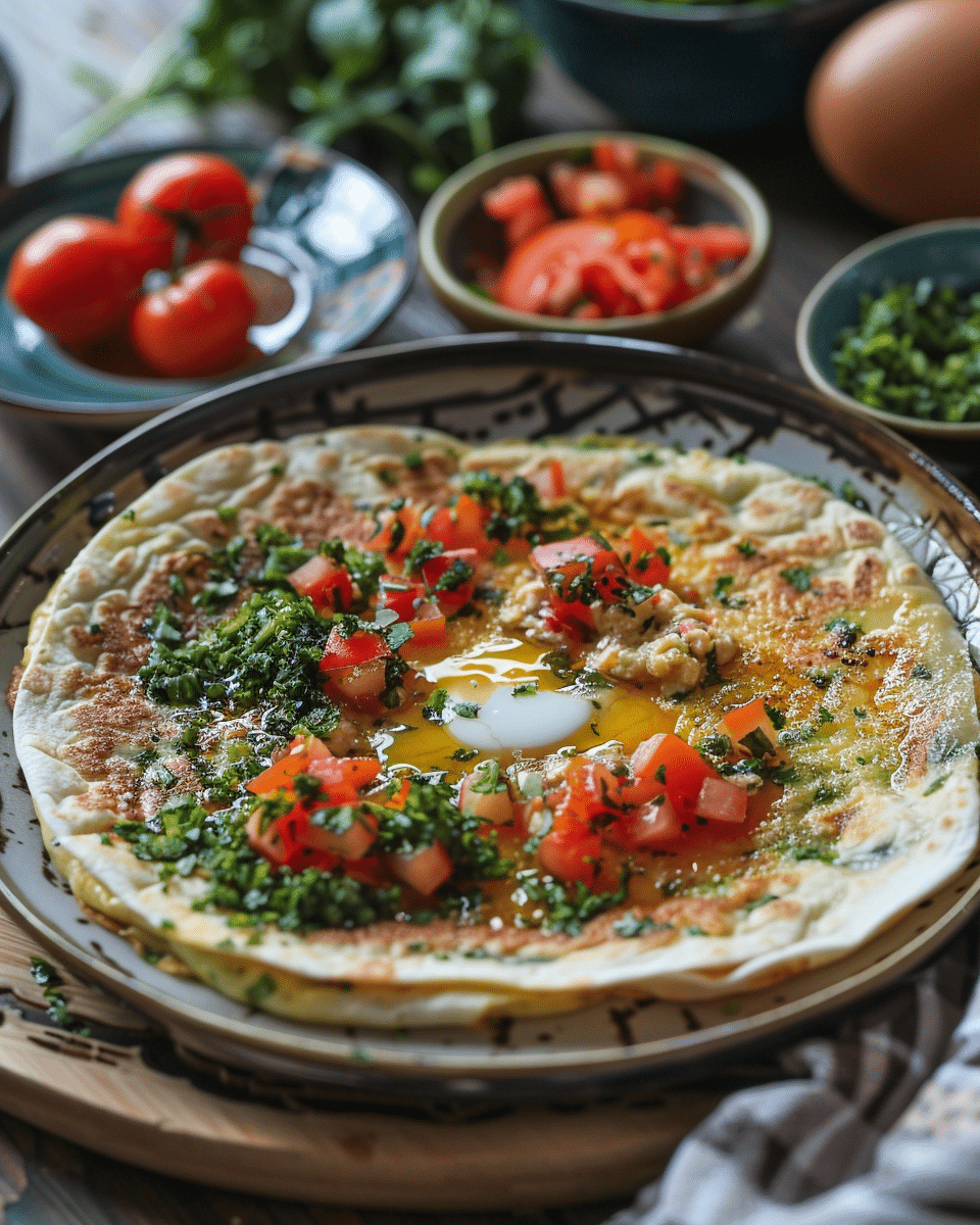 A quick and flavorful omelet wrapped in soft Arabic pita, perfect for a satisfying breakfast or light meal.