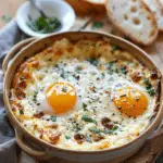 Baked feta eggs is a creamy, savory breakfast dish made with roasted tomatoes, tangy feta cheese, and perfectly baked eggs. It is simple to prepare and packed with Mediterranean flavors.