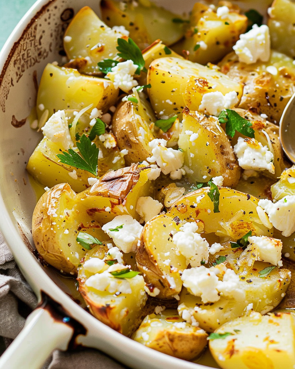 - Remove from the oven and immediately sprinkle the crumbled feta cheese over the hot potatoes.