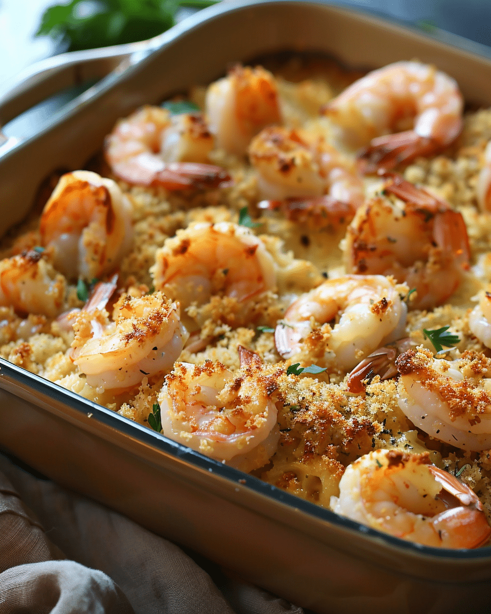 Place the dish in the preheated oven and bake for 12–15 minutes, or until the shrimp are cooked through and the breadcrumbs are golden brown.