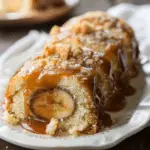 A light and fluffy banana sponge cake rolled with whipped cream and fresh banana slices, topped with a rich homemade caramel sauce and garnished with graham cracker crumbs and powdered sugar.