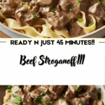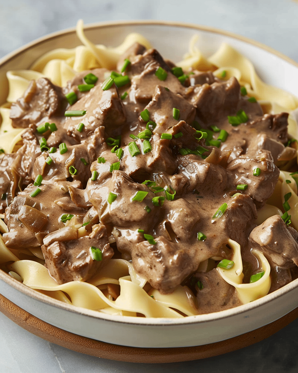 A classic and creamy Beef Stroganoff recipe made with tender strips of beef, mushrooms, and onions in a rich sour cream sauce, served over egg noodles.