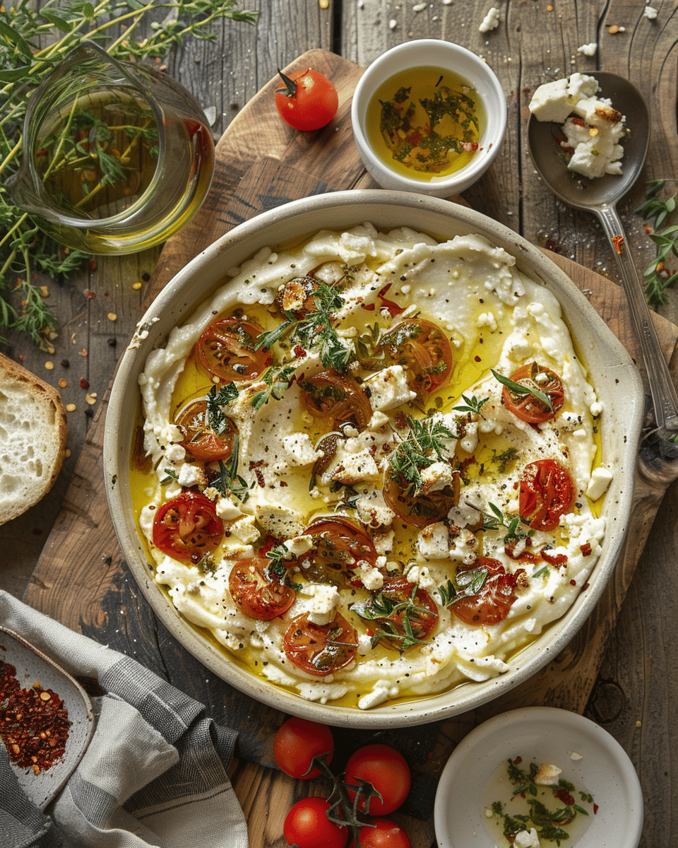 Crispy roasted potatoes baked with creamy feta, garlic, and fresh herbs for a flavorful, comforting dish.