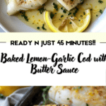 This baked lemon garlic cod with butter sauce is light, flaky, and full of bright citrus flavor. Tender cod fillets are baked to perfection and finished with a rich garlic butter drizzle.