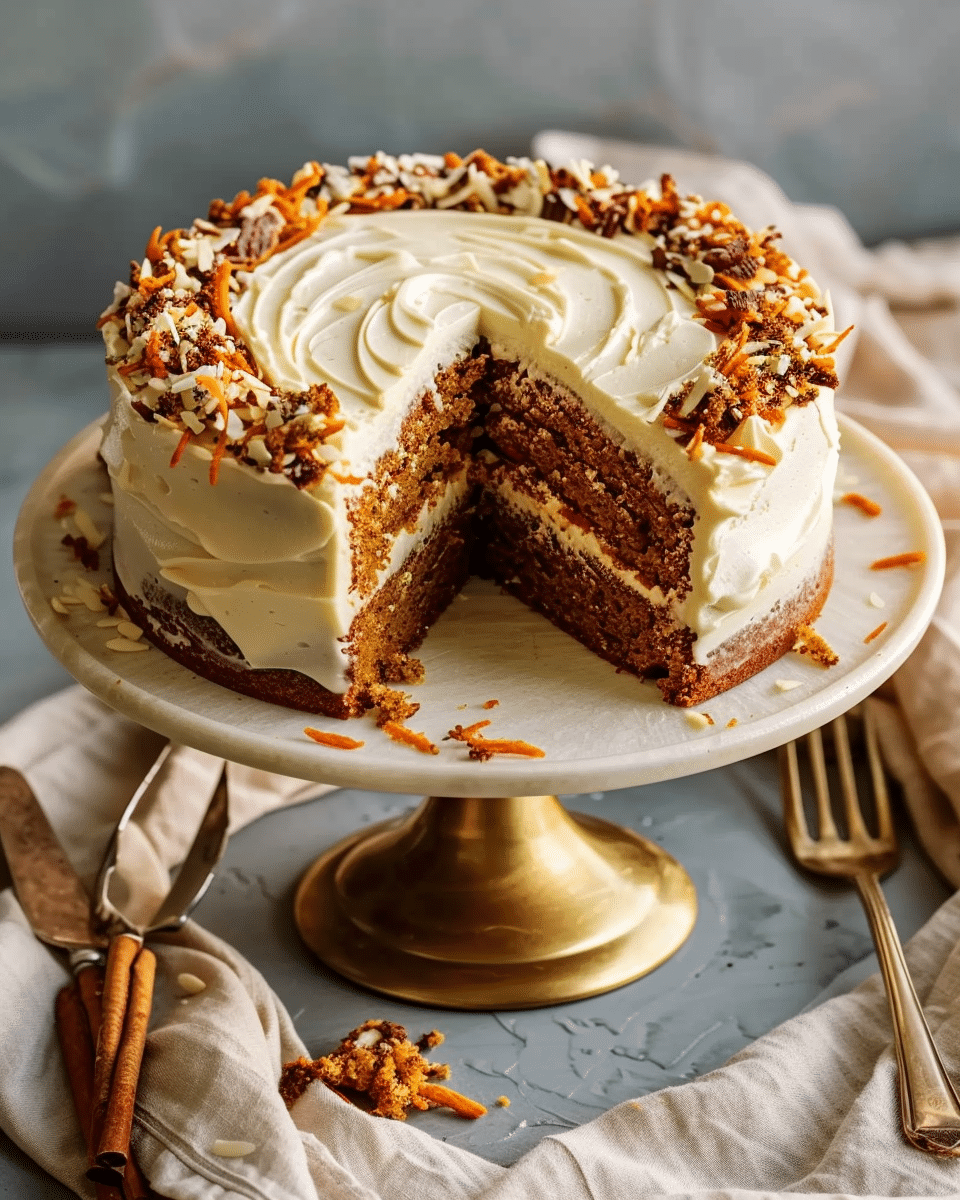 A moist and flavorful carrot cake packed with warm spices, grated carrots, and optional nuts, topped with a rich cream cheese frosting. Perfect for celebrations or a sweet treat anytime.