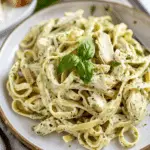 A rich and flavorful creamy chicken pesto pasta made with tender chicken, basil pesto, cream, and parmesan tossed through perfectly cooked pasta for an easy and comforting dinner.