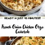 This French Onion Chicken Orzo Casserole is a hearty and flavorful dish combining the savory taste of French onion soup with tender chicken, creamy cheese, and orzo pasta for a perfect comfort meal.