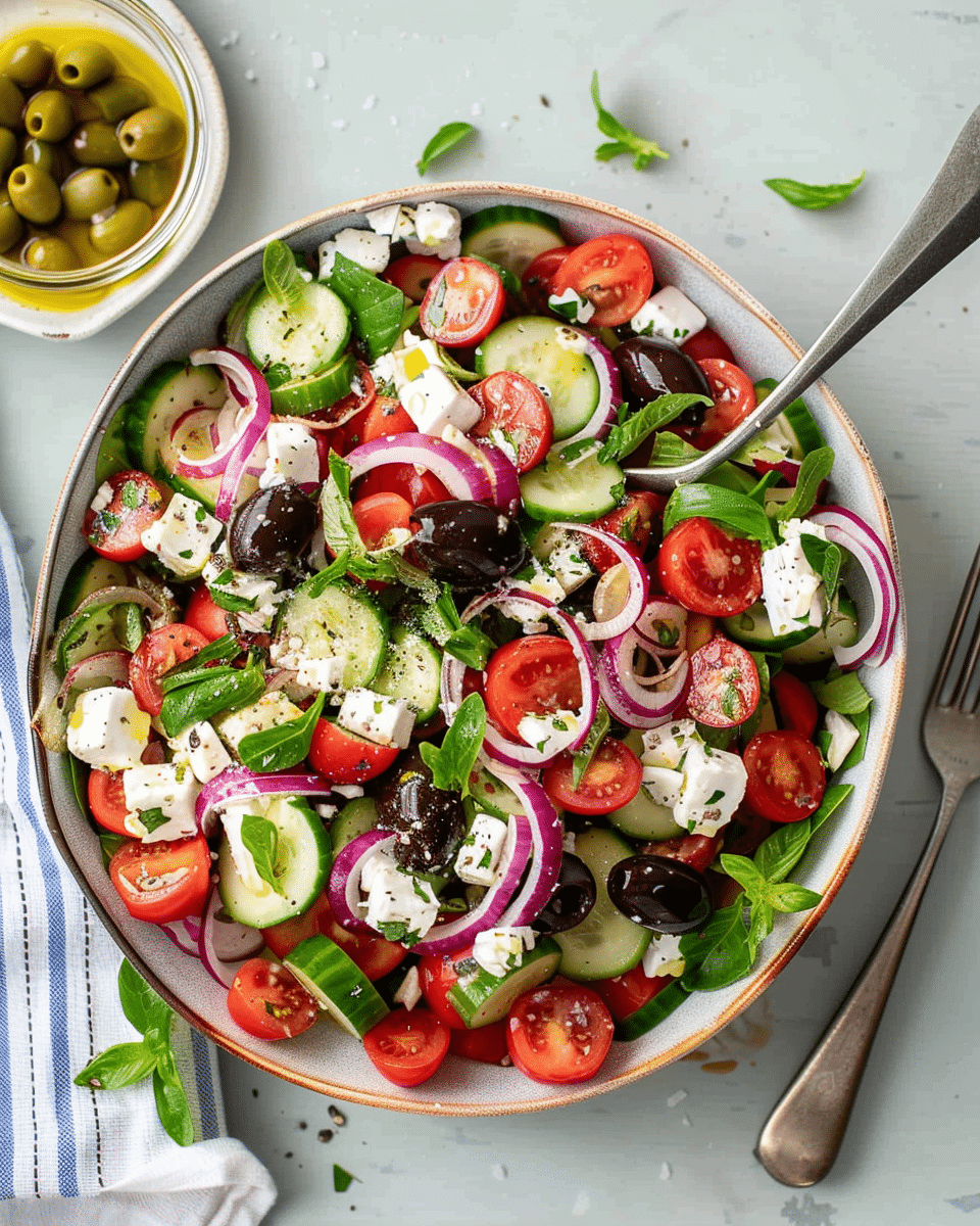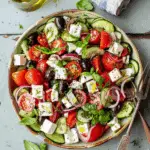 This Greek salad embodies simplicity, freshness, and Mediterranean vibrancy — minimal ingredients, maximal flavor. Its ease, versatility, and bright, clean taste make it a go‑to salad for warm days, casual meals, or when you want a light yet satisfying dish. Whether served on its own, as a side, or adapted into a heartier meal, it’s a classic worth keeping in your recipe rotation.