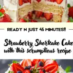 A rich and fruity Strawberry Shortcake Cake featuring fluffy layers of vanilla cake, sweet glazed strawberries, and a creamy whipped topping with a hint of cream cheese.