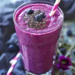 This refreshing smoothie blends sweet peaches and juicy blueberries with almond milk, creamy yogurt, chia seeds, and a hint of vanilla for a naturally sweet, nutrient-packed breakfast or snack. Thickened with chia seeds and sweetened with fruit and dates, it’s satisfying, creamy and full of fiber and antioxidants.