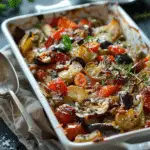 Briam is a traditional Greek baked vegetable dish made with zucchini, potatoes, tomatoes, onions, and olive oil, roasted until tender and caramelized. This rustic Mediterranean recipe is simple, wholesome, and packed with fresh flavors.