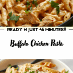 This creamy Buffalo Chicken Pasta is a spicy, cheesy, and comforting dish made with tender chicken, tangy buffalo sauce, and hearty pasta, all cooked in one skillet for an easy weeknight meal.