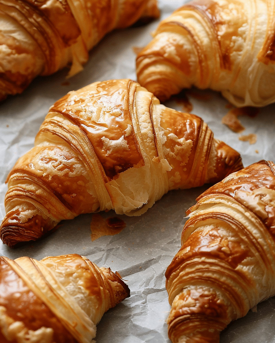 Flaky, buttery croissants with crisp golden layers and a soft, airy interior, perfect for breakfast or brunch.