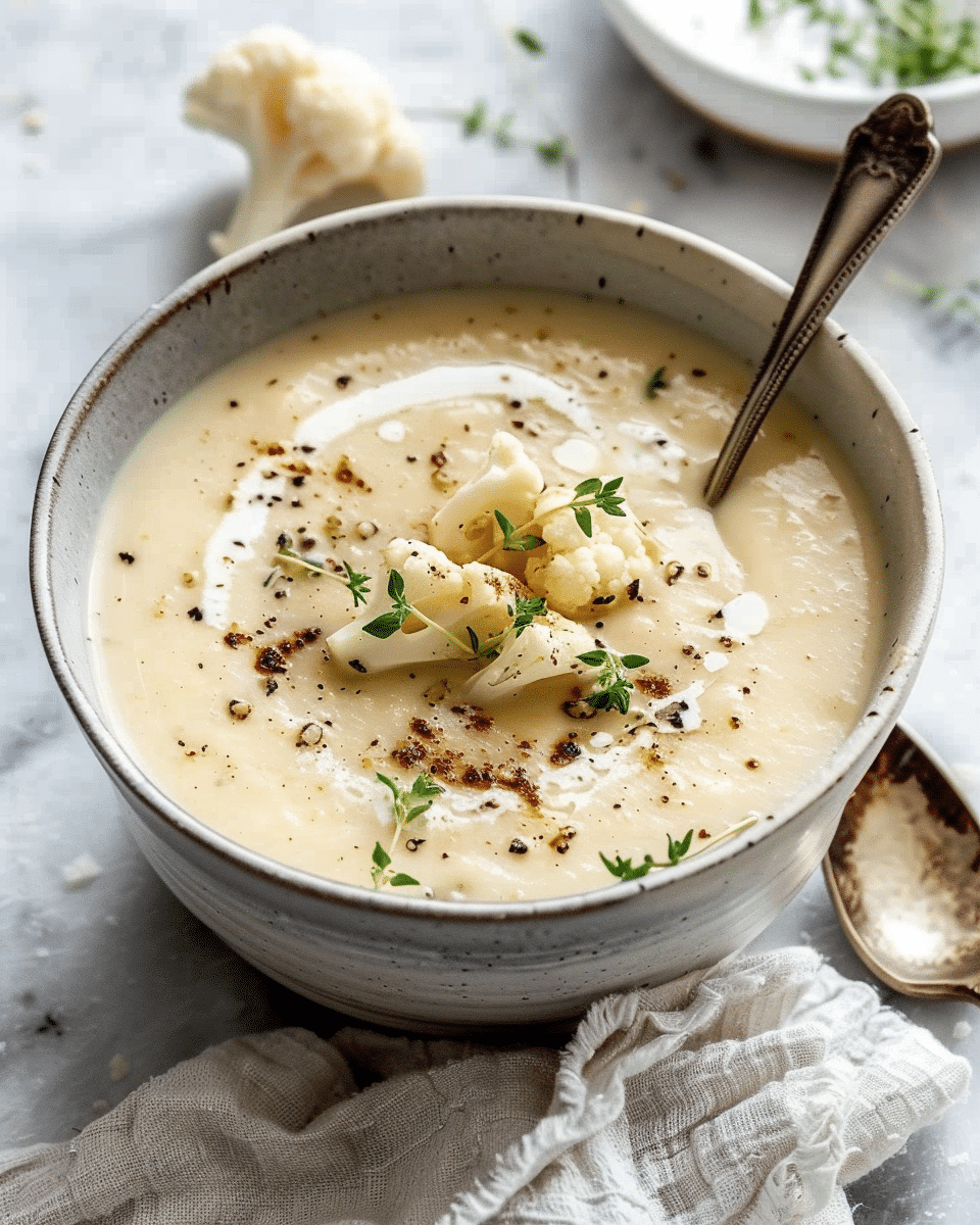 This Cauliflower Soup is rich, creamy, and entirely plant-based. Roasted cauliflower, leeks, and garlic blend into a velvety, flavorful soup that’s cozy, healthy, and perfect for a light lunch or dinner.