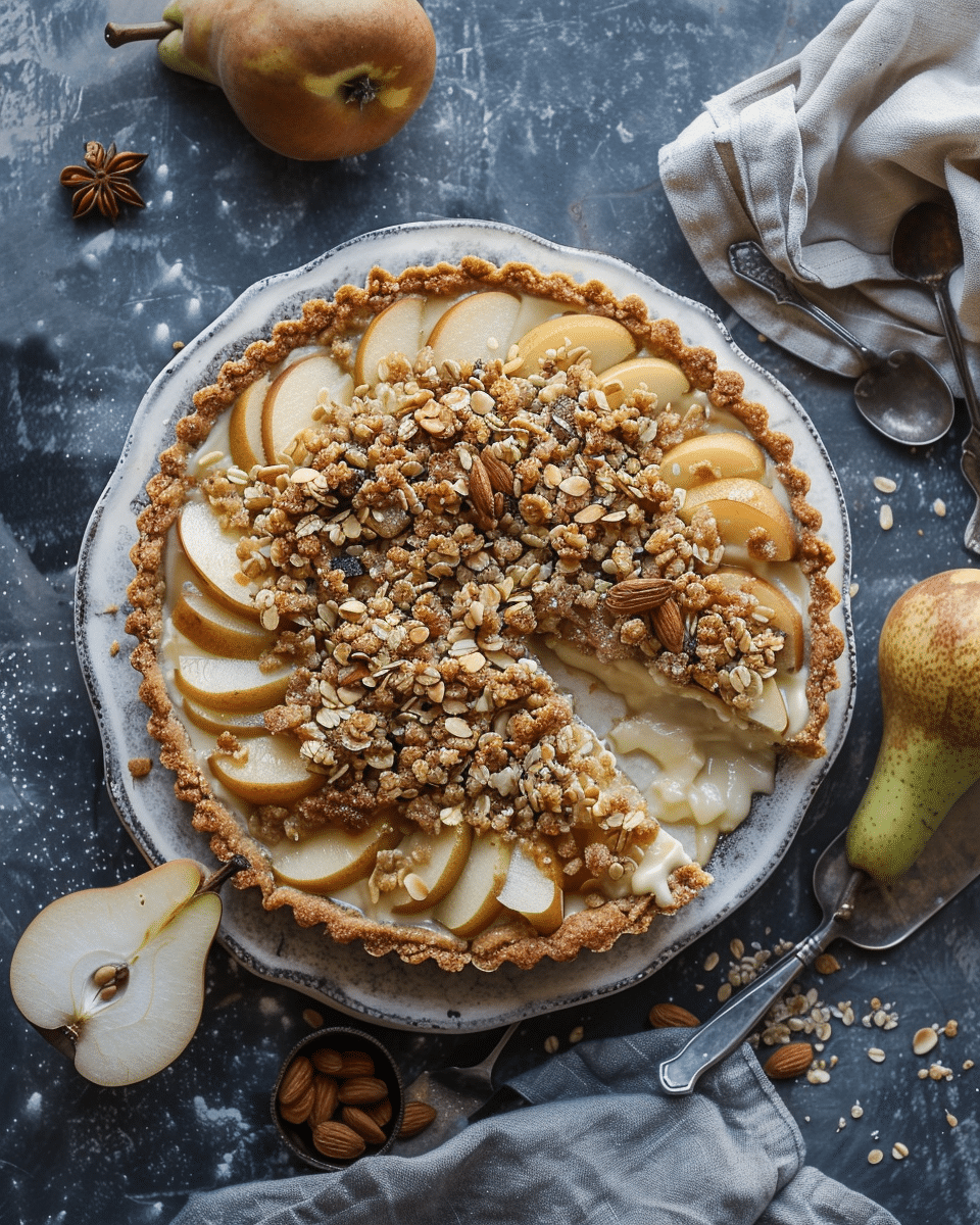 This tart strikes a lovely balance between fruitiness, spice, and crunch. The pears bring natural sweetness and softness, the chai spice blend adds aromatic warmth, and the almond‑oat crumble gives a satisfying, nutty crunch. It doesn’t require advanced baking skills — easy enough for a weekend bake, yet elegant enough for guests.