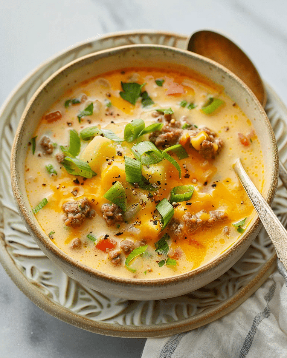 It has all the flavors of a cheeseburger — the beef, the cheese, the creamy “bun‑dip” feel — but in soup form, which adds a fun twist.