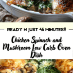 This Chicken, Spinach, and Mushroom Low-Carb Oven Dish is a hearty and healthy meal perfect for keto or low-carb diets. It’s loaded with flavor from tender chicken, fresh spinach, mushrooms, and cheese, all baked into a creamy, satisfying casserole.