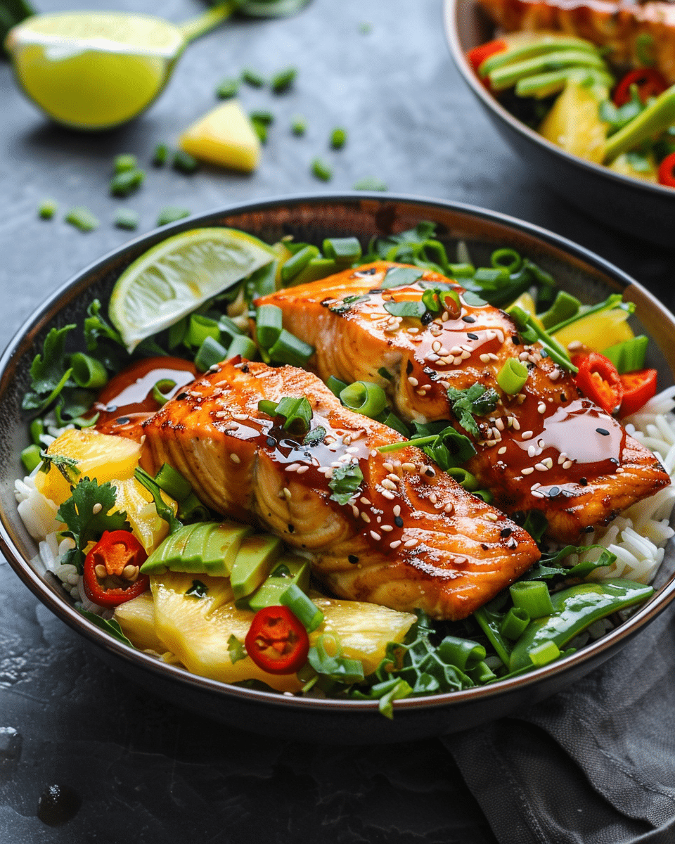 A vibrant salmon bowl featuring tender teriyaki-chipotle glazed salmon, sweet pineapple salsa, and a creamy green sauce. Fresh, zesty, and perfect for a balanced meal.