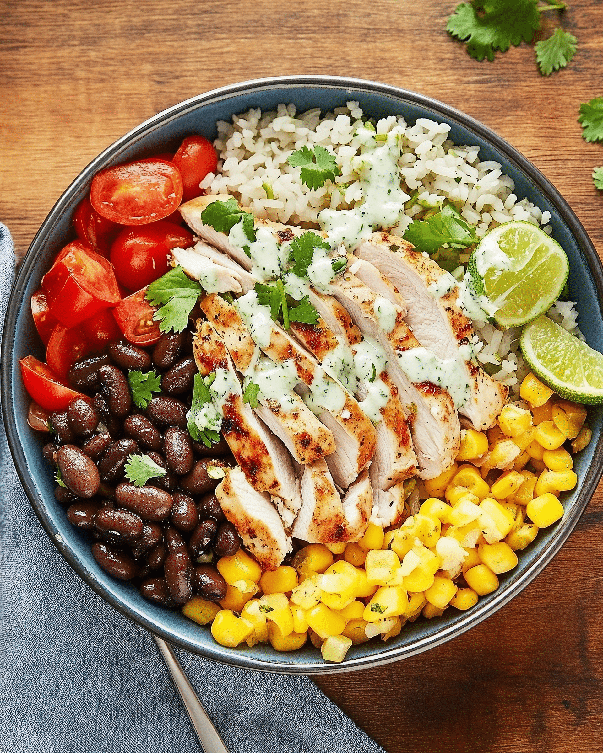 This meal prep recipe is not only bursting with fresh flavors from cilantro, lime, and a variety of vegetables but also offers a great mix of protein, fiber, and healthy fats. The chicken is juicy and flavorful, while the riced cauliflower serves as a low-carb, nutritious base. The addition of corn, black beans, and chili powder adds texture and depth to the dish, making it a filling and satisfying meal. Perfect for lunch or dinner, these cilantro lime chicken bowls are an excellent choice for anyone looking for a balanced, meal-prep-friendly option.