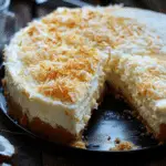 A rich and creamy coconut cheesecake with a buttery crust and tropical coconut flavor, topped with toasted coconut flakes for the perfect dessert.