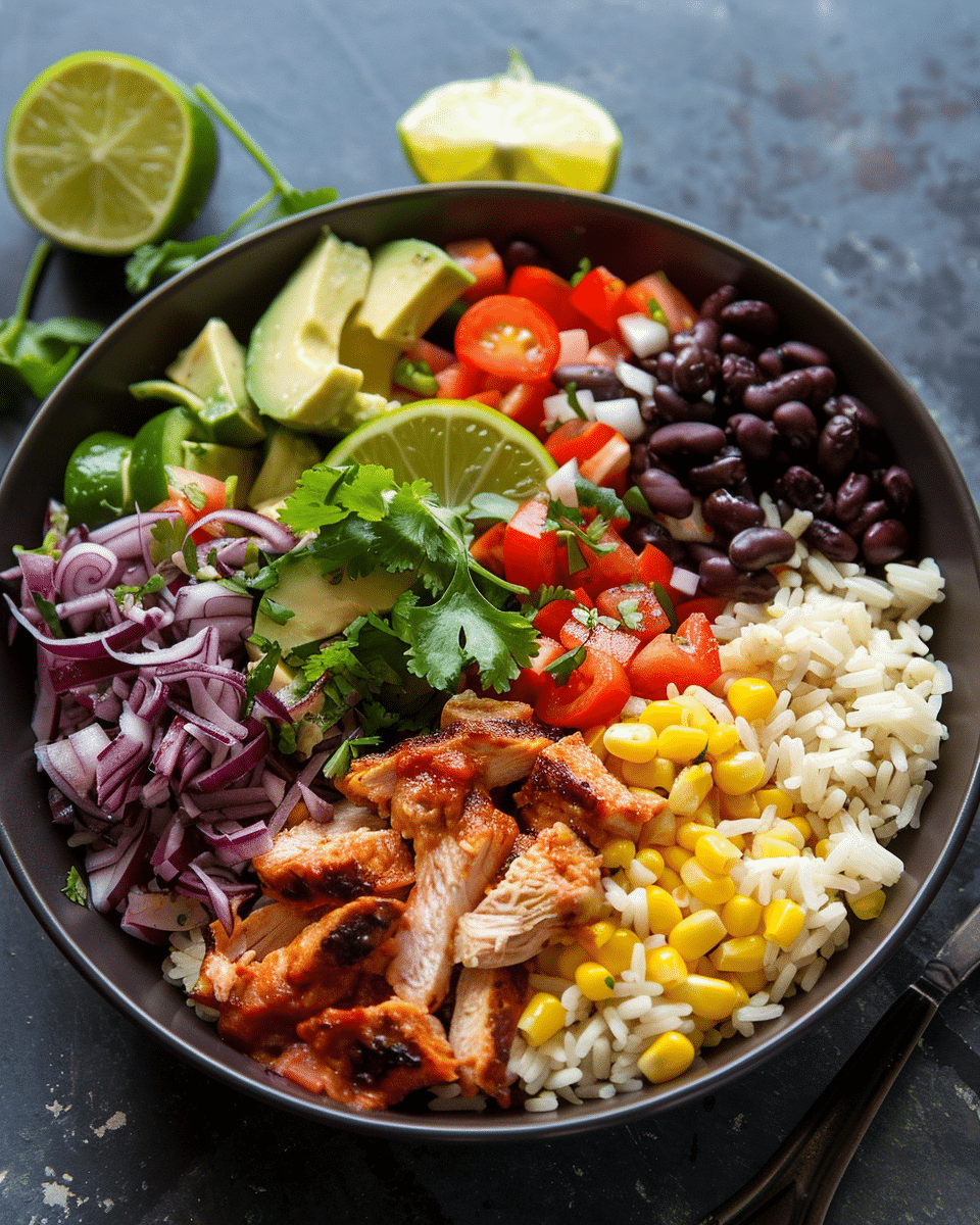 This recipe mimics the flavors and components of Chipotle’s chicken burrito bowl—cilantro‑lime rice, seasoned grilled chicken, beans, corn, pico, guacamole, and cheese—all made at home.