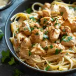 Creamy cowboy butter chicken linguine is a rich and flavorful pasta dish featuring tender seasoned chicken tossed with linguine in a zesty, buttery cream sauce with hints of garlic, lemon, and spice.