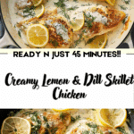 Creamy Lemon & Dill Skillet Chicken is an elegant yet easy meal that balances bright citrus with creamy richness. With minimal prep and one-pan convenience, it’s a perfect choice for busy weeknights or casual entertaining. Whether served with vegetables, grains, or pasta, it brings a refreshing burst of flavor to your table.