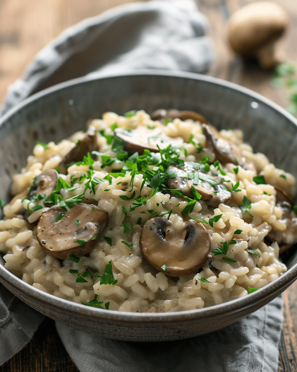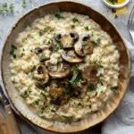 A cozy, creamy mushroom risotto made with Arborio rice, sautéed mushrooms, and rich Parmesan cheese, perfect for a comforting vegetarian meal.