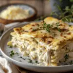 Creamy White Cheese Chicken Lasagna is a rich and comforting twist on the classic lasagna, featuring layers of tender chicken, spinach, and a silky white sauce, all baked to golden perfection.