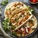 Crispy pita bread topped with seasoned chicken, crumbled feta, and fresh vegetables, baked to golden perfection for a flavorful and satisfying Mediterranean-inspired meal.