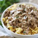 A rich and comforting crockpot beef stroganoff made with tender stew meat, creamy mushroom sauce, and egg noodles. Perfect for an easy, slow-cooked family meal.