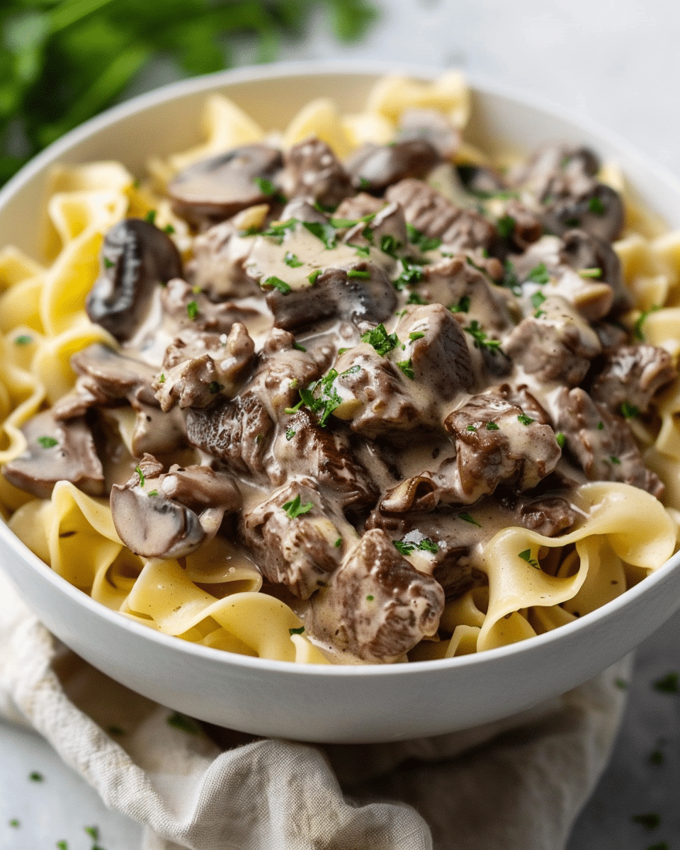 There are several easy ways to customize this crockpot beef stroganoff. For a deeper mushroom flavor, add sliced fresh mushrooms during the first few hours of cooking. You can swap the stew meat for cubed chuck roast if you want an even richer result. Sour cream can be stirred in at the end for a more traditional stroganoff taste. If you prefer to keep the noodles separate, serve the beef mixture over mashed potatoes, rice, or even cauliflower mash. A little fresh parsley on top adds a nice pop of color and freshness.