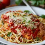 A comforting slow-cooked chicken Parmesan with rich tomato sauce, melted cheese, and crispy Parmesan breadcrumbs served over spaghetti.