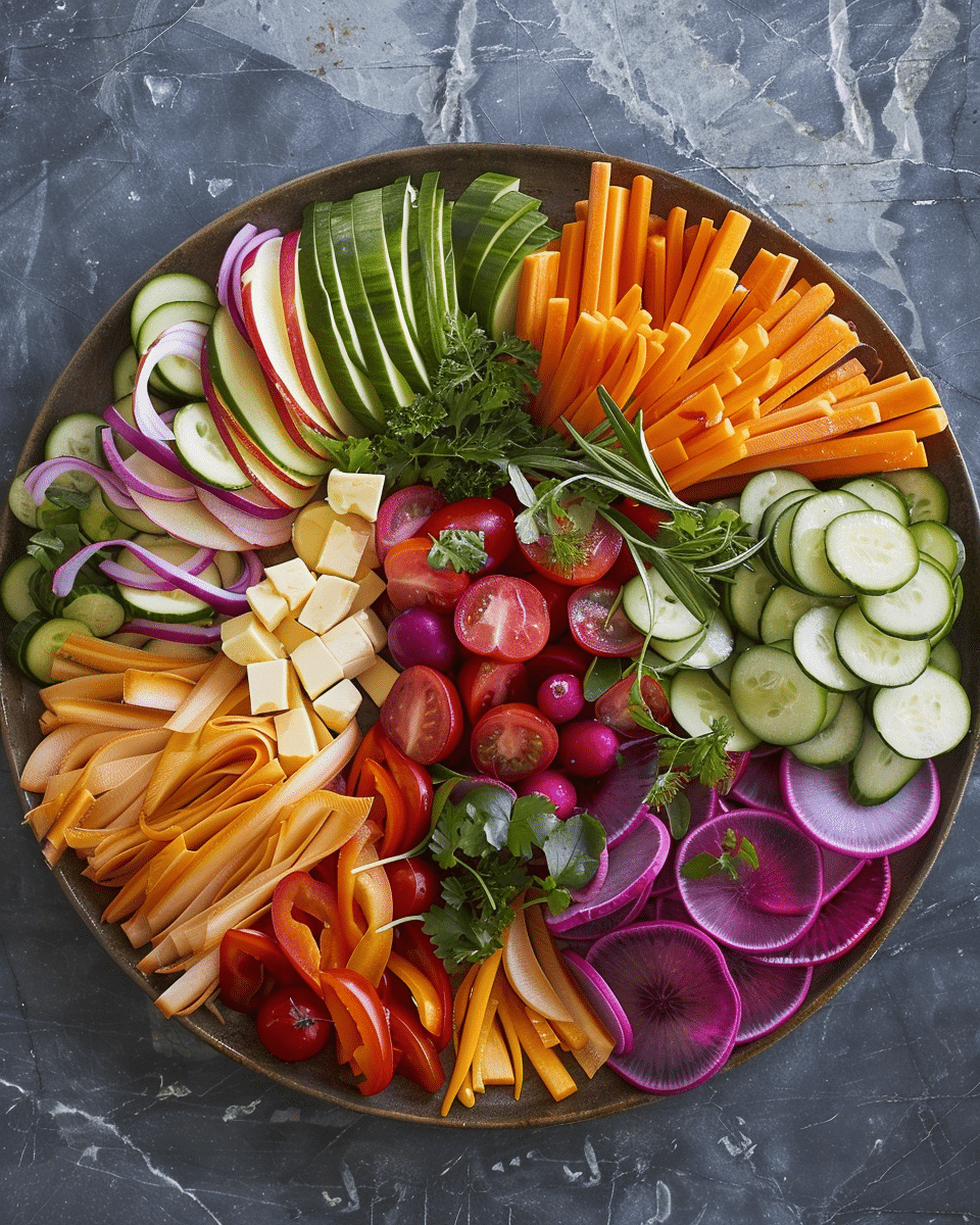 A vibrant crudité platter featuring fresh, crisp vegetables paired with flavorful dips for a colorful and healthy appetizer.