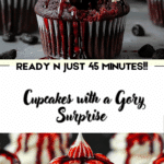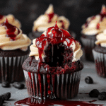 These Cupcakes are spooky treats with a gory raspberry surprise center, making them perfect for Halloween parties or themed gatherings.