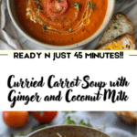 A creamy vegan carrot soup infused with warm curry spices, fresh ginger, and rich coconut milk for a comforting and flavorful dish.