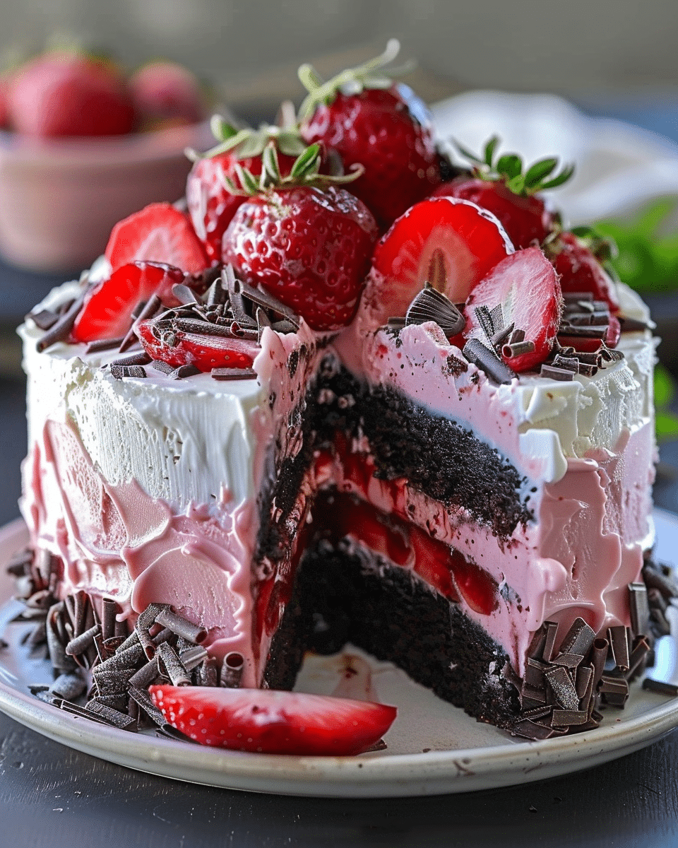 A luxurious frozen dessert featuring layers of moist chocolate cake, creamy strawberry ice cream, homemade strawberry compote, and smooth chocolate ganache. Perfect for summer celebrations or indulgent moments.