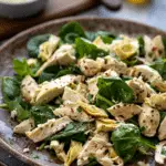 A creamy and flavorful spinach artichoke chicken salad inspired by the classic dip, combining tender chicken, fresh spinach, artichokes, and a rich, savory dressing.
