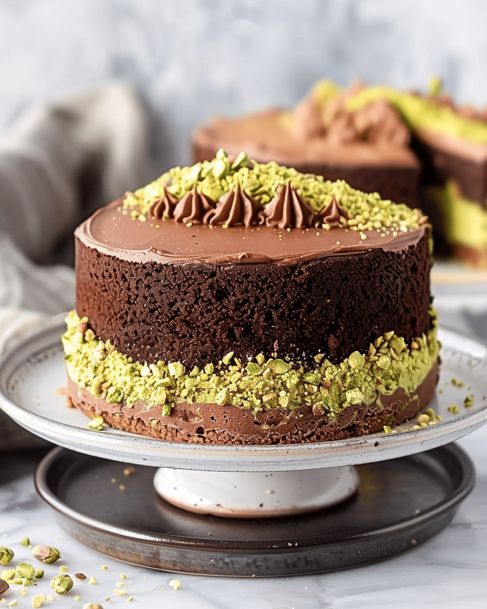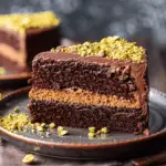 A rich, indulgent chocolate cake infused with the flavors of Dubai, featuring layers of moist chocolate sponge, creamy pistachio filling, and a glossy chocolate ganache topping.
