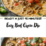 Easy Beef Queso Dip is the ultimate comfort food appetizer that’s rich, cheesy, and full of flavor. Whether you’re watching the big game, hosting a party, or just looking for a delicious snack, this dip is always a hit. With its quick prep and endless variations, it’s a recipe you’ll return to again and again.