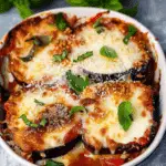 This easy Eggplant Parmesan recipe is a simplified, healthier version of the classic Italian dish. It features baked—not fried—eggplant slices layered with marinara sauce and cheese, making it a lighter yet still delicious comfort food option.