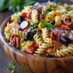 A vibrant and hearty Italian Antipasto Pasta Salad packed with meats, cheeses, veggies, and a zesty homemade dressing—perfect for potlucks or quick lunches.
