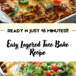This Easy Layered Taco Bake is a simple yet flavorful dish that brings all the comforting elements of a taco dinner into one baked casserole. With its layers of seasoned beef, tortillas, and cheese, this dish is perfect for a busy weeknight meal. Plus, it’s easy to customize, making it a great choice for families or anyone looking for a comforting, satisfying meal. Try it today and enjoy the delicious flavors of taco night in a whole new way!