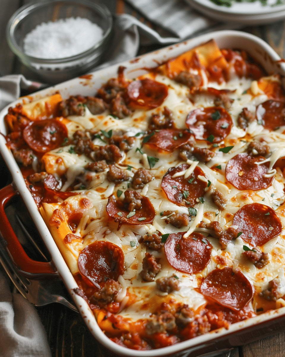 Pizza Casserole is a hearty, family-friendly baked pasta dish loaded with Italian sausage, pasta, rich tomato sauce, and plenty of melted mozzarella and pepperoni for a comforting meal that is perfect for busy weeknights or as a freezer-friendly dinner.