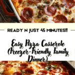 This easy pizza casserole is the perfect combination of convenience and comfort. With simple ingredients, flexible variations, and freezer-friendly options, it’s a dependable recipe that belongs in every busy home cook’s collection. Whether you’re serving it fresh from the oven or reheating leftovers the next day, it delivers classic pizza flavor in every hearty bite.