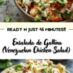 Ensalada de Gallina is a traditional Venezuelan chicken salad made with shredded chicken, potatoes, carrots, peas, and a creamy mayonnaise-based dressing. It’s a classic dish often served during holidays and special gatherings.