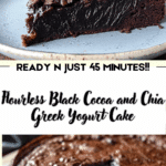 This flourless black cocoa and chia Greek yogurt cake is a rich, fudgy dessert that’s naturally gluten-free, packed with protein from Greek yogurt and eggs, and gets its deep color and intense flavor from black cocoa powder and chia seeds.