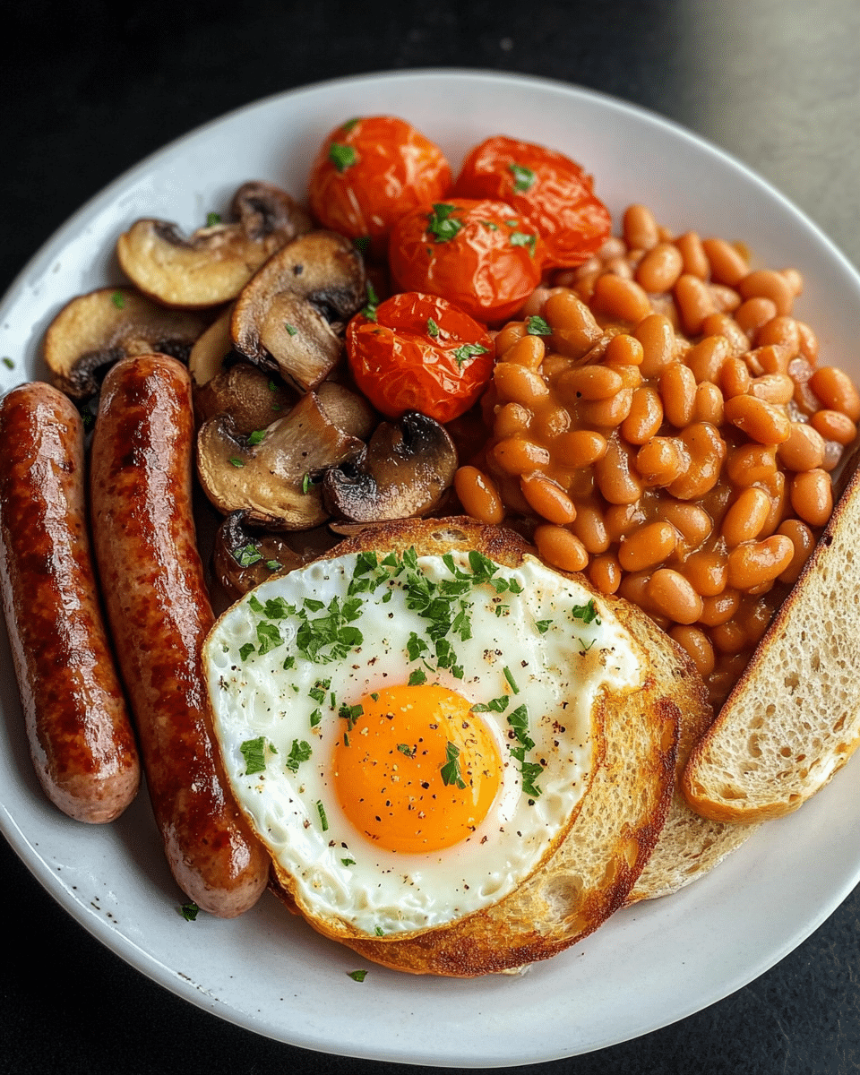Enjoy a hearty and satisfying Full English Breakfast that includes crispy toast, savory chicken sausages, perfectly cooked eggs, grilled mushrooms, juicy tomatoes, and homemade or canned baked beans. This classic British breakfast is packed with flavor and will keep you full all morning long. A delicious and fulfilling meal to start your day!