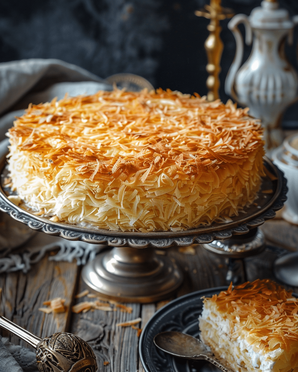 If kataifi is difficult to find, the same custard can be used with traditional phyllo sheets, though the final texture will be different. Kataifi gives the dessert its signature nest-like crunch.